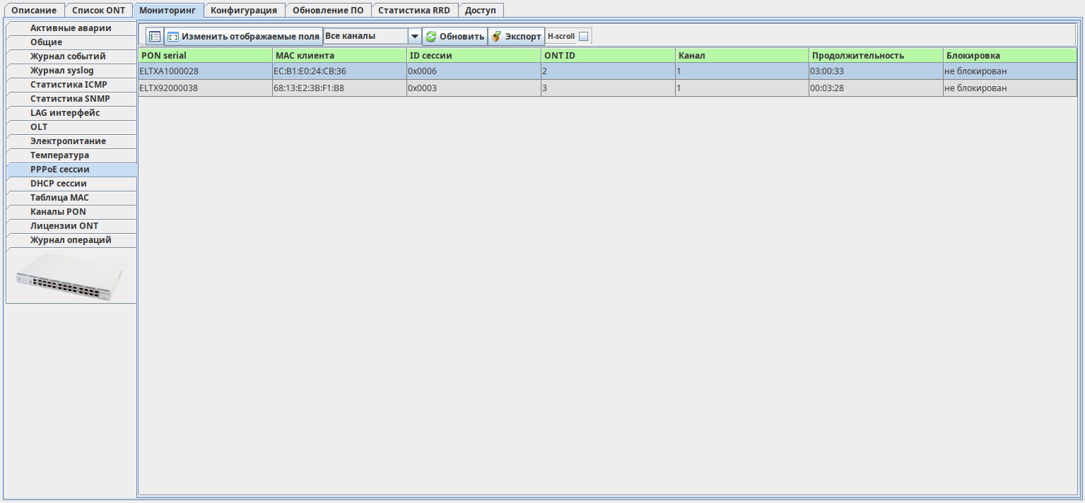 Вкладка «PPPoE сессии» содержит таблицу с полями PON serial, MAC клиента, ID сессии, ONT ID, Канал, Продолжительность, Блокировка.