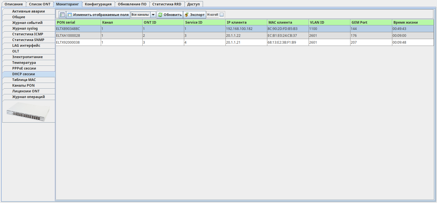 Вкладка «DHCP сессии» содержит таблицу с полями PON serial, Канал, ONT ID, Service ID, IP клиента, MAC клиента, VLAN ID, GEM Port, Время жизни.