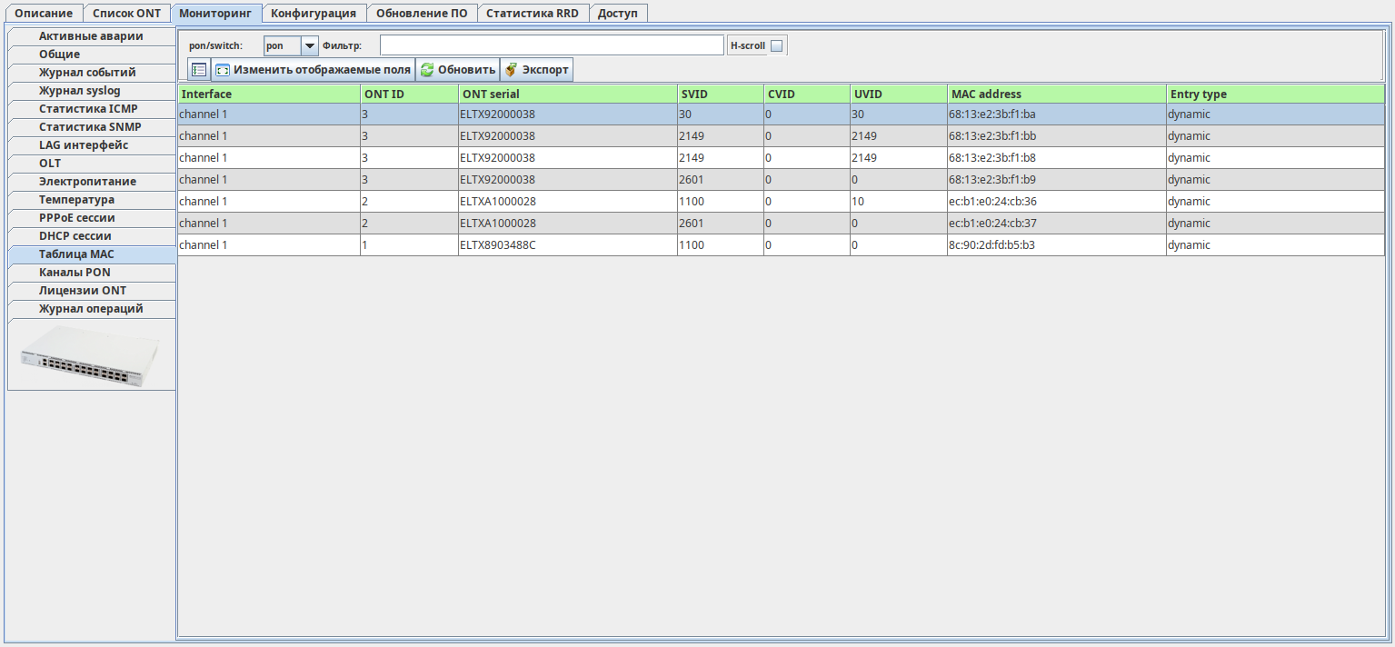 В данной вкладке производится мониторинг таблицы МАС-адресов всех ONT, подключенных к портам pon или switch (front-port, port-channel). При помощи выпадающего списка «Pon/Switch» возможно выбрать определенный тип портов, для которых будет отображена информация.