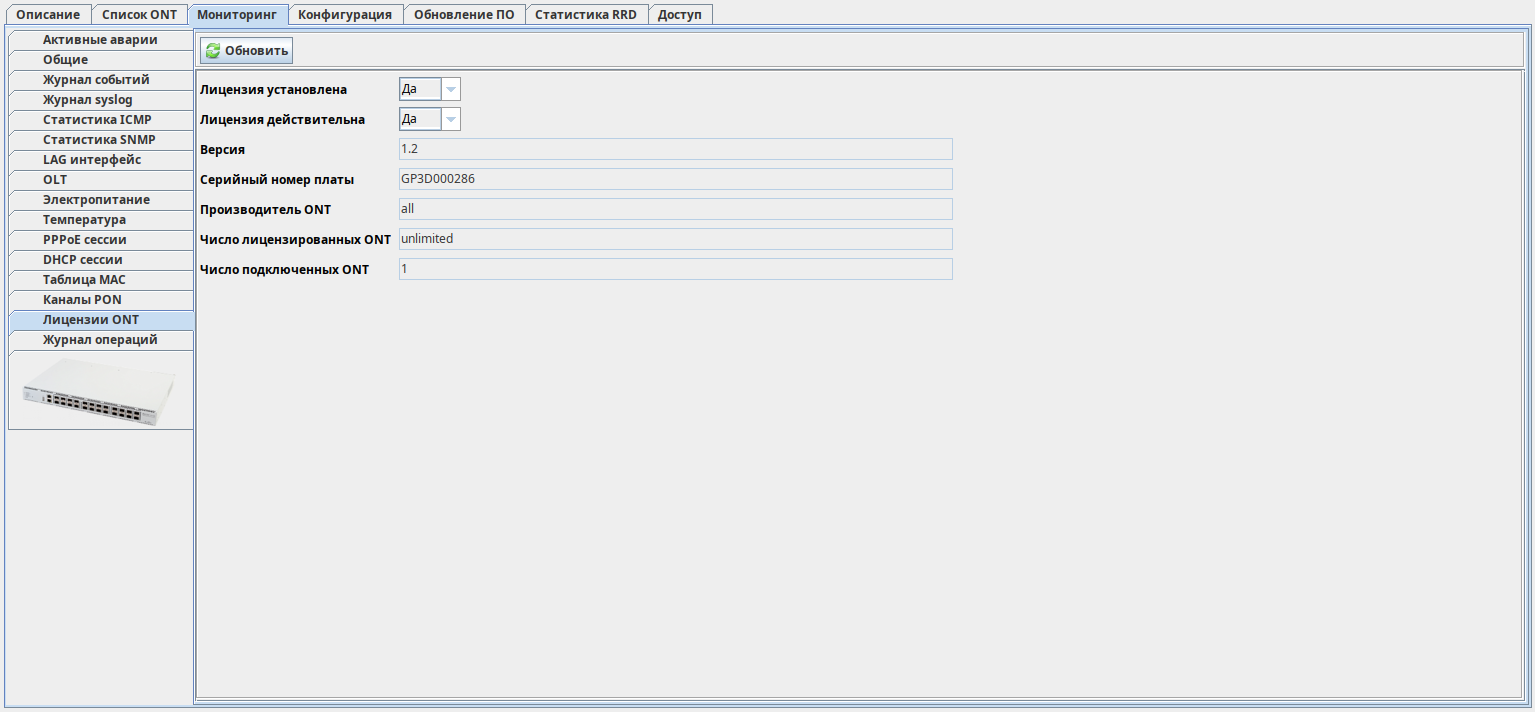 В данной вкладке доступна информация об установленной на OLT лицензии для подключения ONT сторонних производителей. Информация доступна только для чтения. Установка лицензии на OLT возможна через CLI.