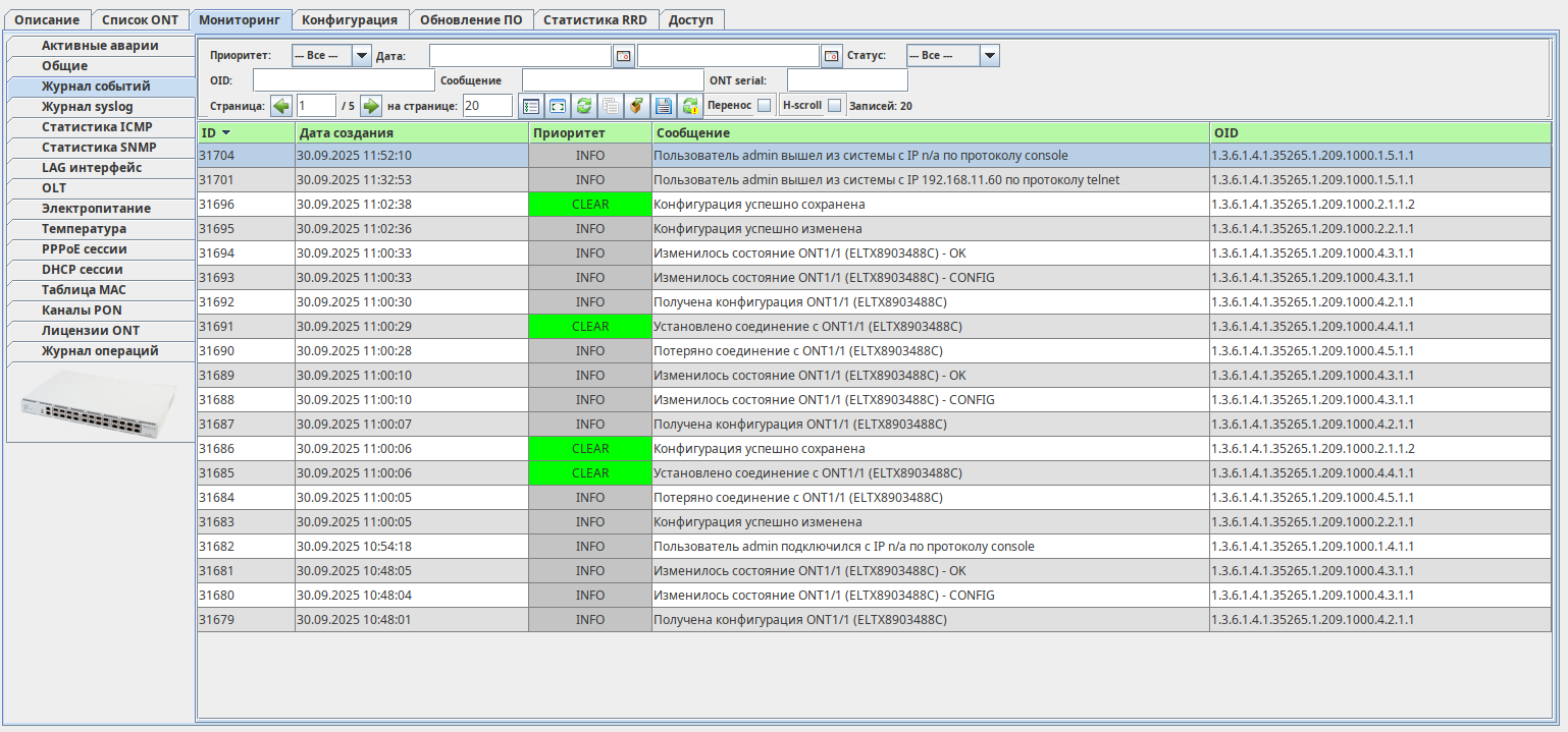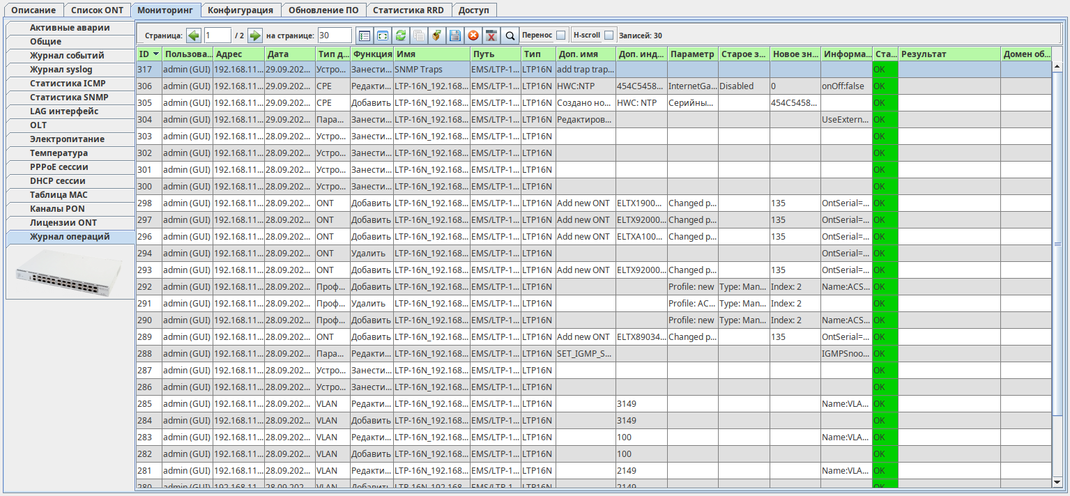 В данной вкладке доступна подробная информация о действиях, совершенных из GUI EMS, совершенных над данным OLT.