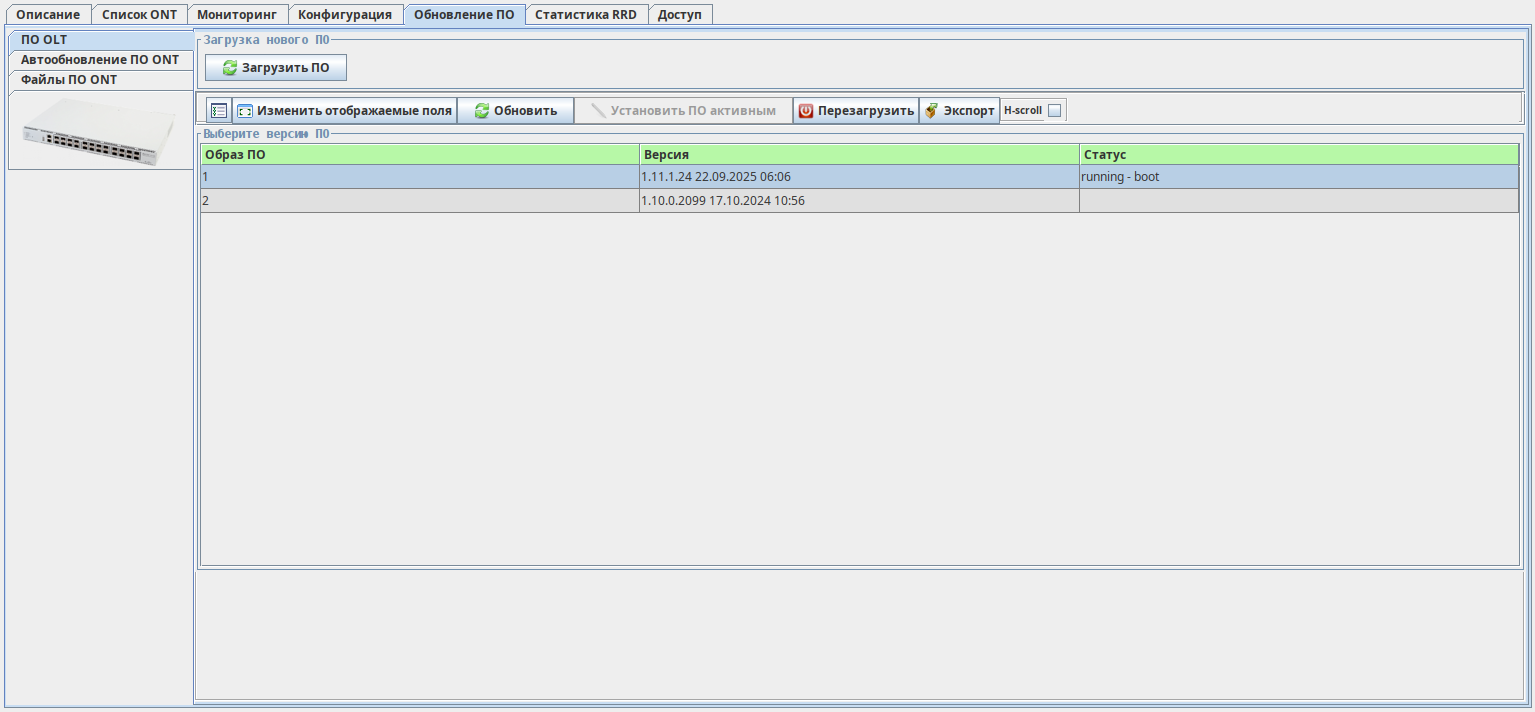 Работа с программным обеспечением OLT, ONT (кроме команд выборочного обновления ПО ONT) осуществляется в данном разделе. Раздел включает три вкладки: «ПО OLT», «Автообновление ПО ONT», «Файлы ПО ONT».