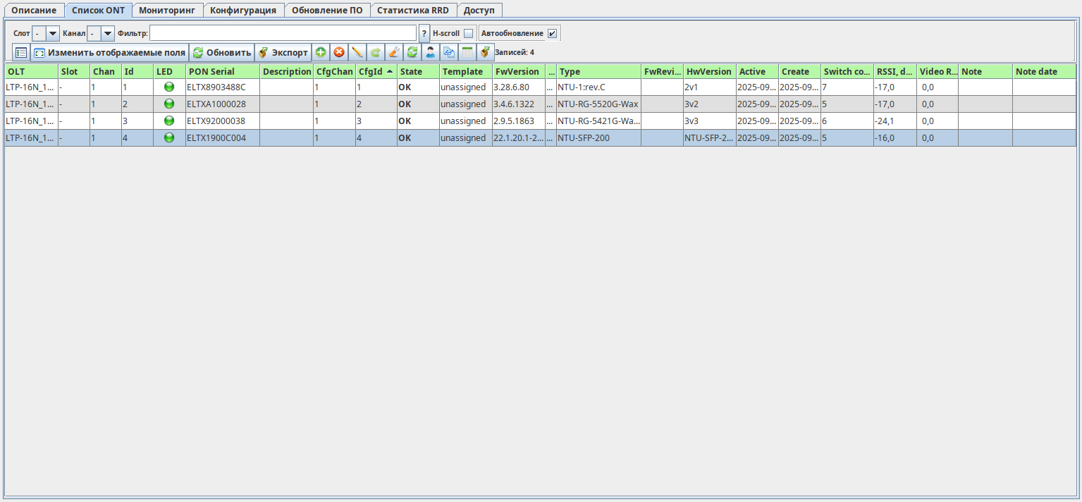 В данном разделе отображается информация обо всех ONT, зарегистрированных на устройстве и физически подключенных к PON-каналам ONT, а также их характеристики.