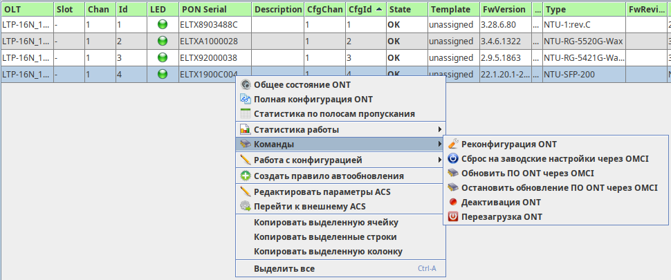 По клику правой кнопкой мыши по выбранному ONT открывается контекстное меню с запросом подробной информации об ONT и возможными операциями.