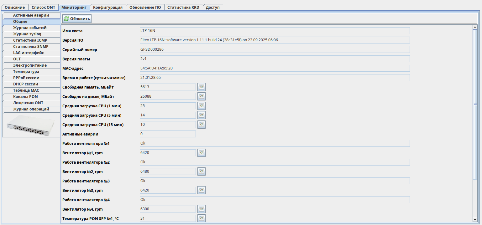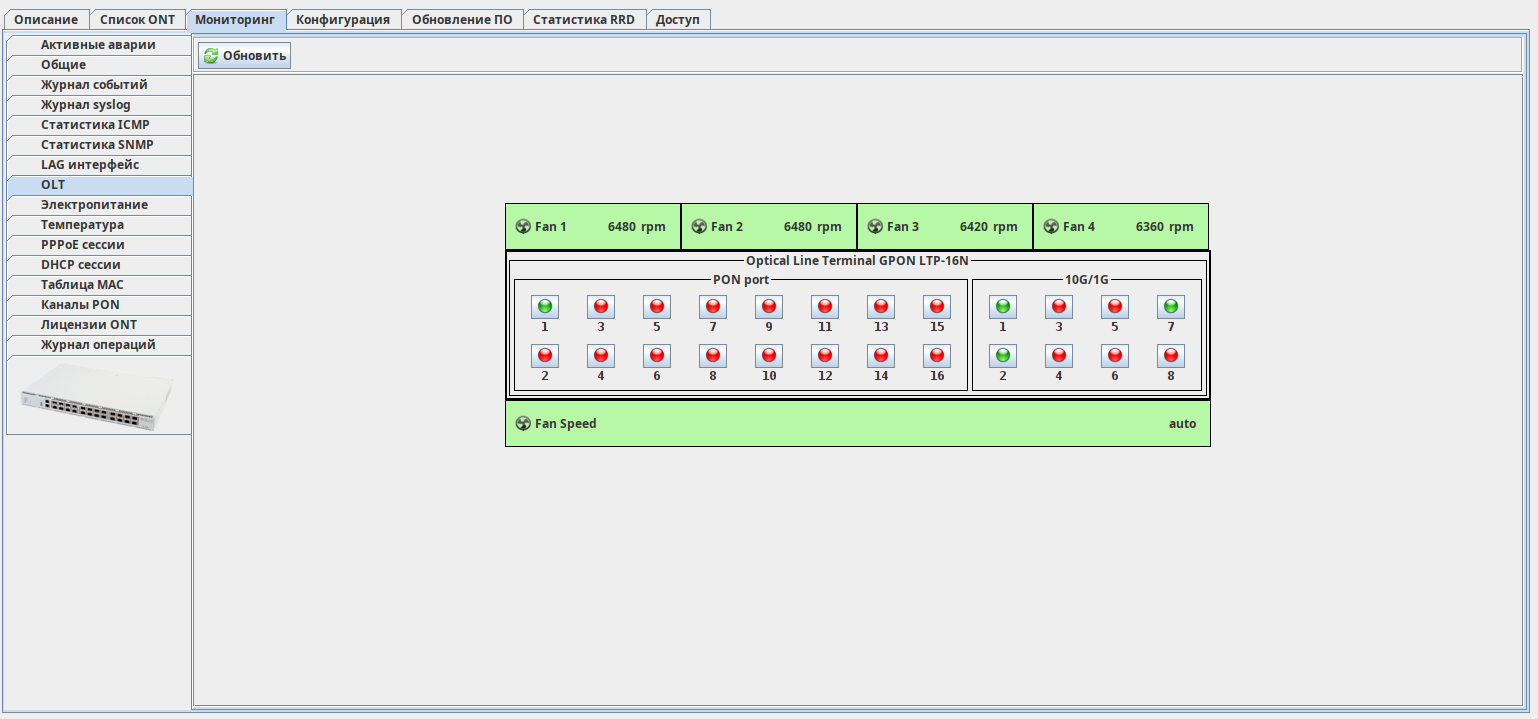 В данной вкладке осуществляется оперативный мониторинг состояния портов OLT, а также состояния и скорости вращения вентиляторов.