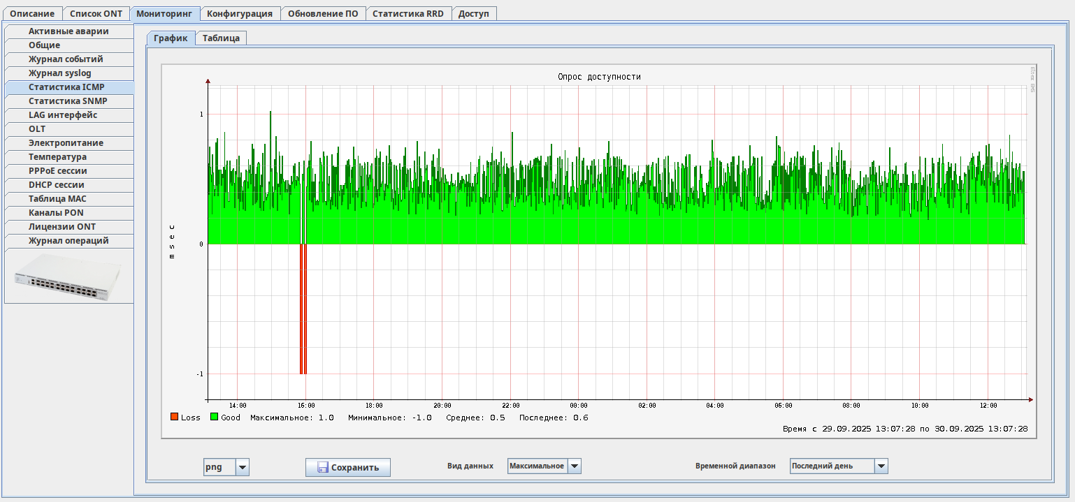 В данной вкладке отображается временная диаграмма задержки получения ответов на ICMP-запросы (ping). Система EMS самостоятельно выполняет периодический ICMP-опрос устройств. Красными точками на графике отмечаются ошибки получения ответа на ICMP-запросы.