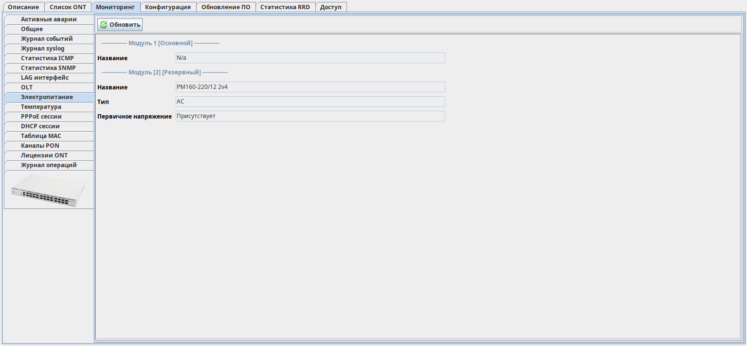 Раздел содержит данные о текущем состоянии подключенных к OLT источников питания: название модуля, тип питания и статус первичного напряжения.