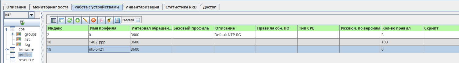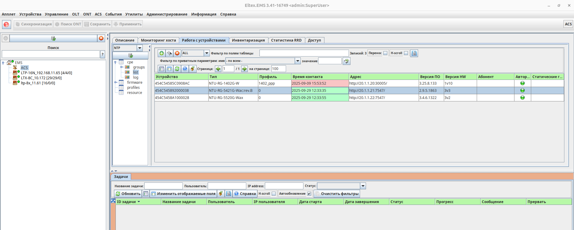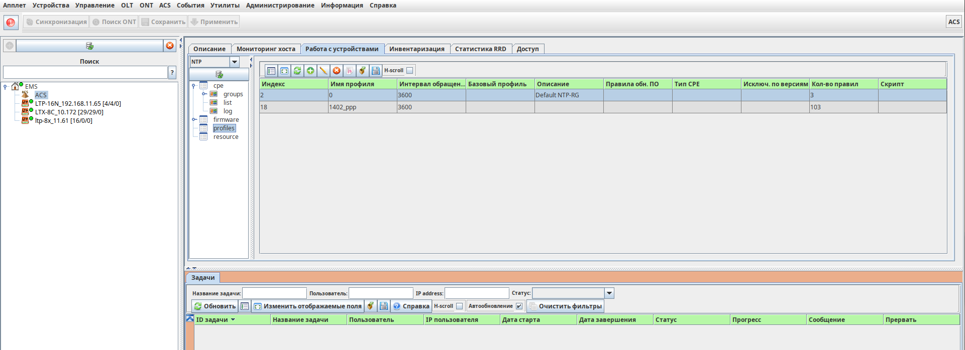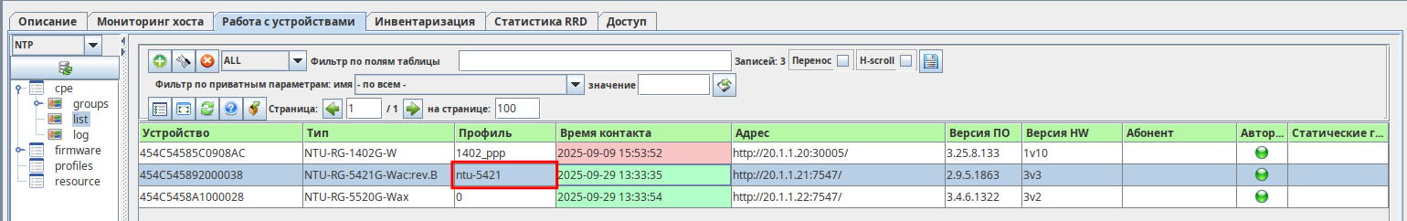 После добавления профиля на ACS-сервер необходимо вернуться в раздел, содержащий список ONT («CPE» → «list»).