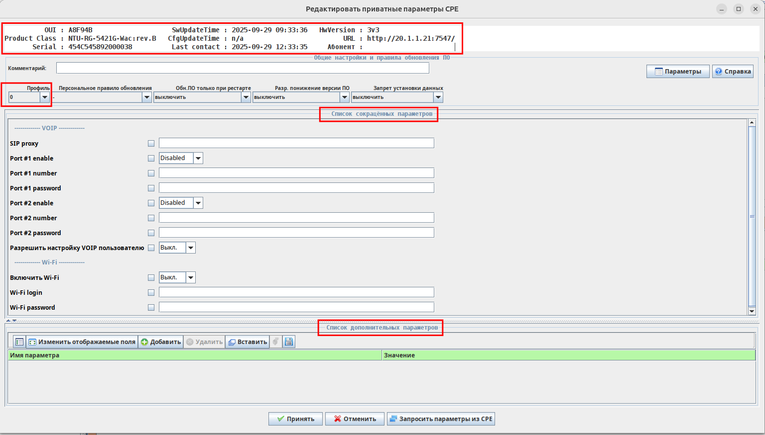 • Список сокращенных параметров — индивидуальные параметры ONT в графическом виде (поля задаются XML-шаблонами редактирования конфигурации ONT);
