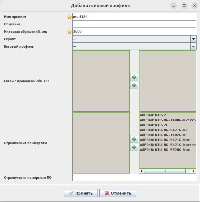 • Поле для назначения ACS-профиля — позволяет выбрать конфигурационный ACS-профиль;