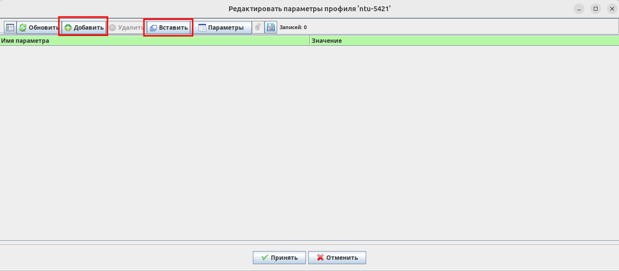 Далее необходимо осуществить наполнение ACS-профиля. Переход в режим редактирования профиля осуществляется двойным нажатием левой кнопкой мыши по выбранному профилю. Для вставки содержимого ACS-профиля могут быть использованы кнопки "Добавить" и "Вставить".