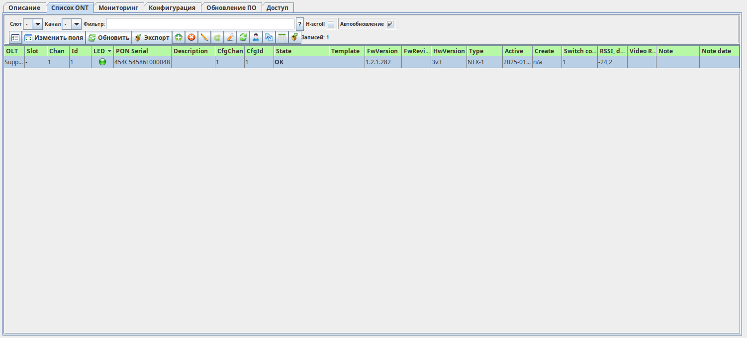 Управление ONT и их конфигурациями осуществляется во вкладке «Список ONT». В данном списке отображаются зарегистрированные и незарегистрированные ONT. На скриншоте ниже приведен пример данного раздела при отсутствии сконфигурированных ONT и при наличии подключенного, но незарегистрированного ONT.