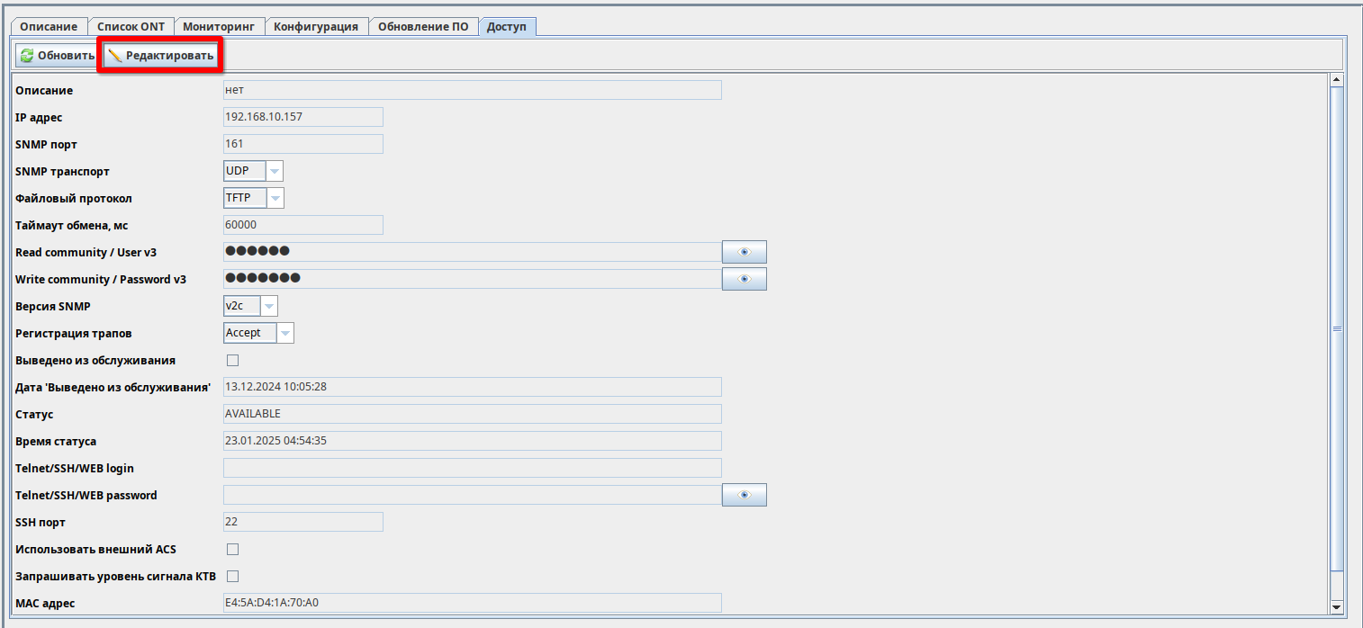 После добавления устройства взаимодействие системы управления с устройством будет осуществляться со значениями community public и private по умолчанию. Если они были изменены, необходимо указать новые настройки для этого устройства в EMS. Нужно выбрать устройство в дереве объектов, далее перейти во вкладку «Доступ», нажать на иконку редактирования и указать корректные параметры доступа.