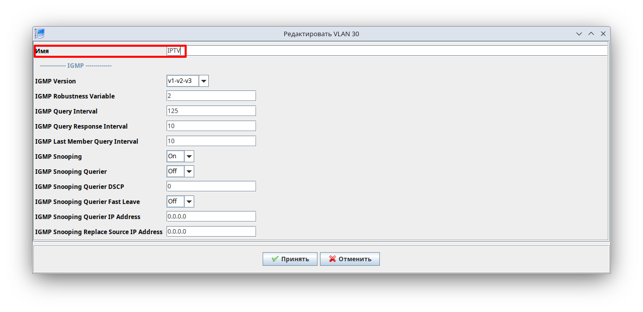 Далее автоматически откроется окно редактирования VLAN. Здесь можно указать индивидуальные параметры обработки multicast для создаваемого VLAN, а также можно указать имя VLAN в конфигурации. При создании VLAN можно оставить значения всех параметров по умолчанию. В качестве примера укажем имя «IPTV» для VLAN.