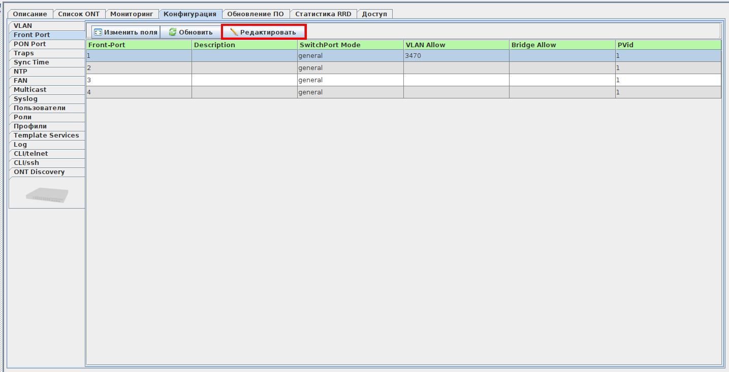 Настройка VLAN на Uplink-интерфейсах OLT выполняется на вкладке Front-port. Для редактирования назначенных на интерфейс VLAN выделите в списке нужный Front-port, далее нажмите кнопку «Редактировать».