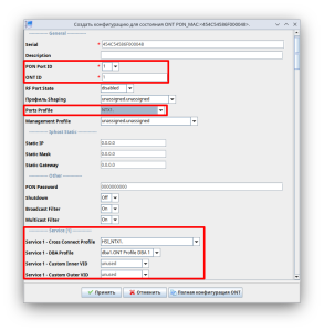 Регистрация ONT и назначение конфигурации могут быть выполнены по двойному клику по ONT в списке. В результате откроется окно, где ONT необходимо присвоить id в конфигурации и назначить необходимые сервисные профили. Поля Serial и PON Port ID заполнятся автоматически исходя из реального значения PON serial и физического номера PON-порта, к которому подключается ONT. Поле ONT ID также заполнится автоматически исходя из следующего по порядку свободного ONT ID. Данные значения могут быть скорректированы вручную. После указания необходимой информации в текущем окне нажмите Принять, на панели управления выполните действие Применить.