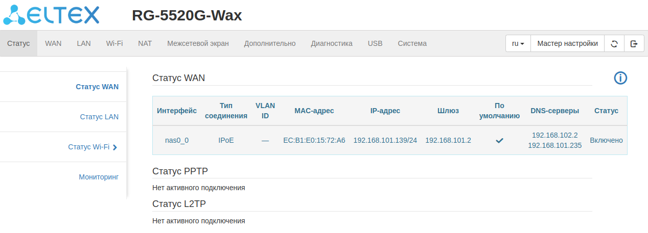 В качестве домашнего маршрутизатора может использоваться роутер Eltex RG-5520G-Wax. Рассмотрим его настройку для представленной схемы через веб-интерфейс.