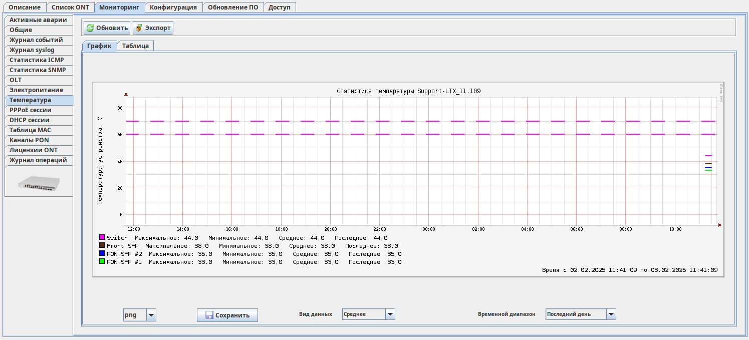 В данной вкладке доступна графическая статистика изменения показания датчиков температуры, установленных внутри модулей. В графике наглядно отображается зависимость измеряемого параметра от времени. Вид графика (диаграмма или линейный), вид данных (среднее или максимальное), а также выводимый временной диапазон (от последних двух часов до недели) возможно настроить в соответствующих выпадающих полях под графиком.