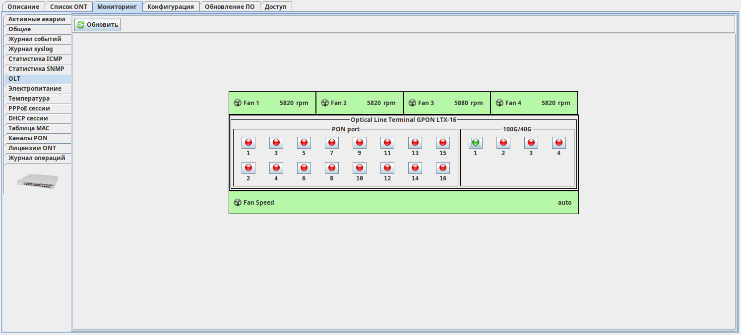 В данной вкладке осуществляется оперативный мониторинг состояния портов OLT, а также состояния и скорости вращения вентиляторов.