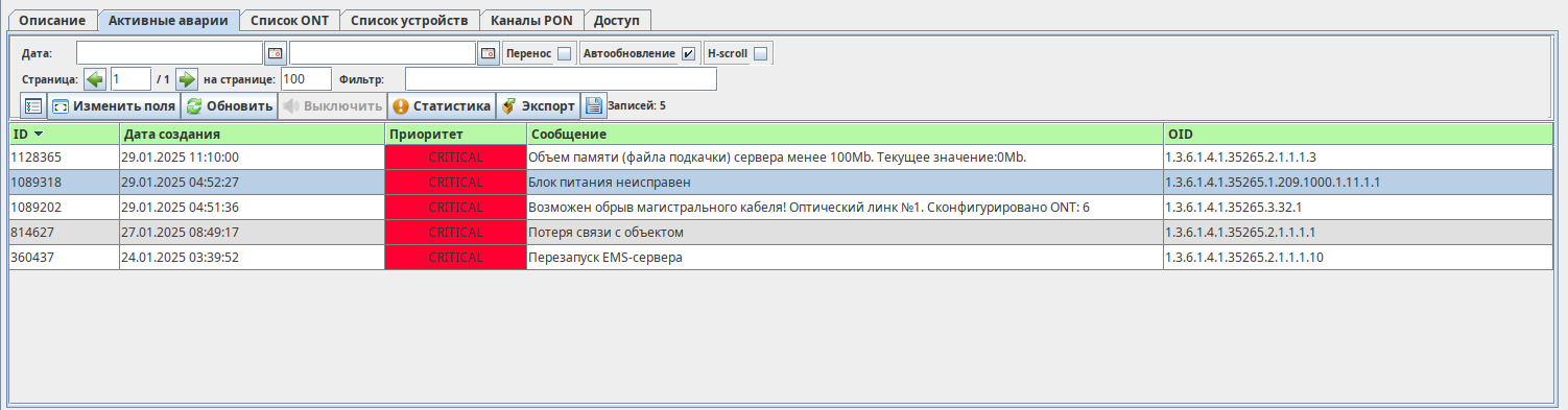Вкладка содержит список текущих аварийных и внештатных событий устройства. События в данном списке создаются при получении аварийных трапов от устройств либо при работе внутренних периодических служб системы (например, контроль доступности, контроль температуры). Копия каждого события при его возникновении сохраняется в журнал событий данного устройства. В случае автоматической нормализации (например, при получении нормализующего трапа или восстановлении канала обмена) событие стирается из списка активных событий, но остаётся в журнале. В журнале фиксируются как аварийные, так и нормализующие сообщения.