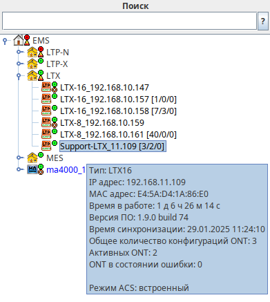 При выборе устройства в дереве объектов и наведении на него курсором доступна краткая информация о текущем состоянии устройства в виде всплывающей подсказки.