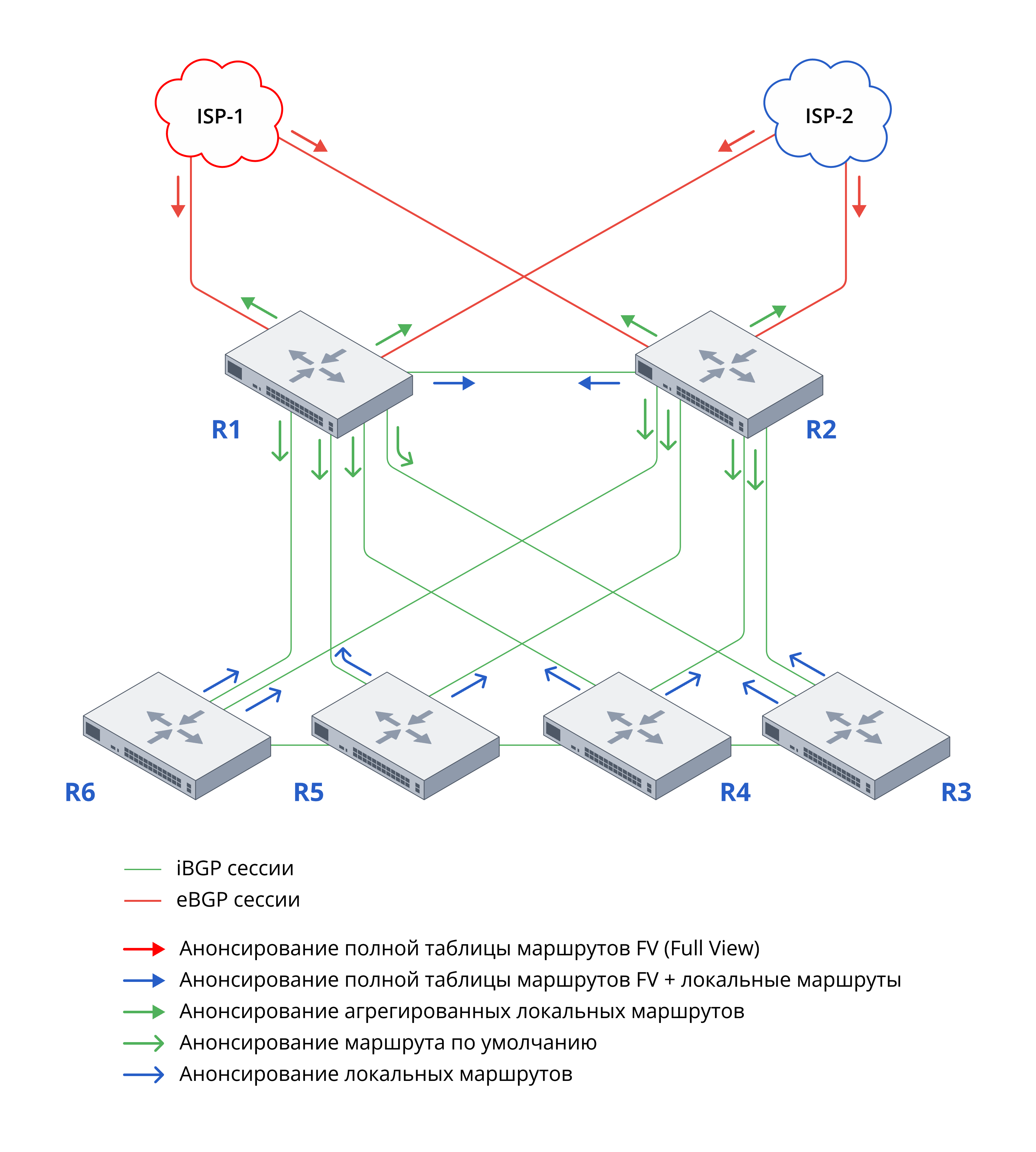 При организации BGP-связности внутри AS требуется обеспечить полную связность маршрутизаторов каждого с каждым. Во избежание излишнего количества BGP-соседств и упрощения конфигурации применяется механизм RR. Маршрутизаторы CORE в контексте iBGP выступают в роли RR.