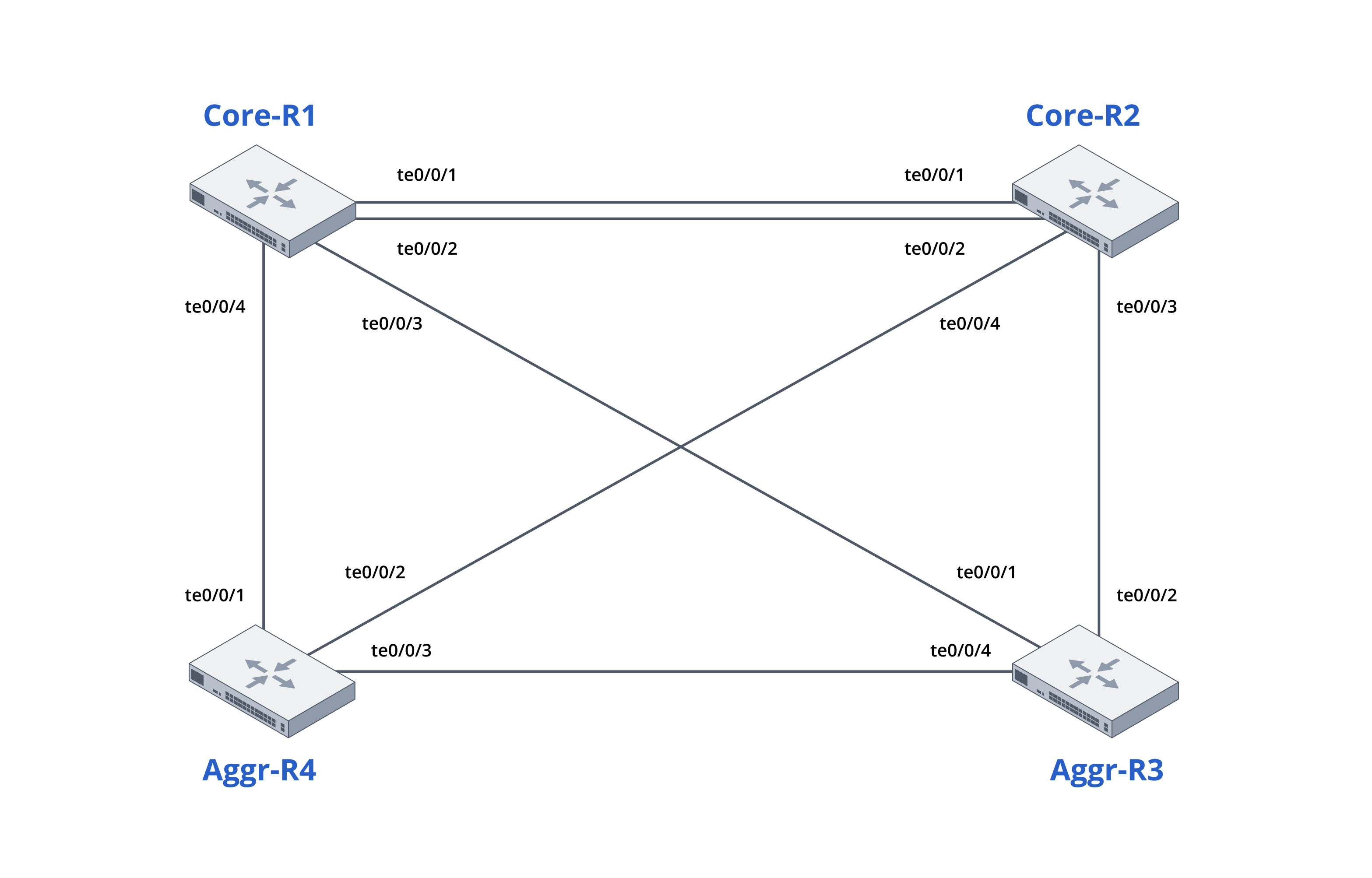 Примеры конфигураций будут предложены для несколько упрощенной схемы, приведенной ниже. Схема состоит из четырех маршрутизаторов, корневые маршрутизаторы соединены двумя линками, которые будут собраны в LAG.