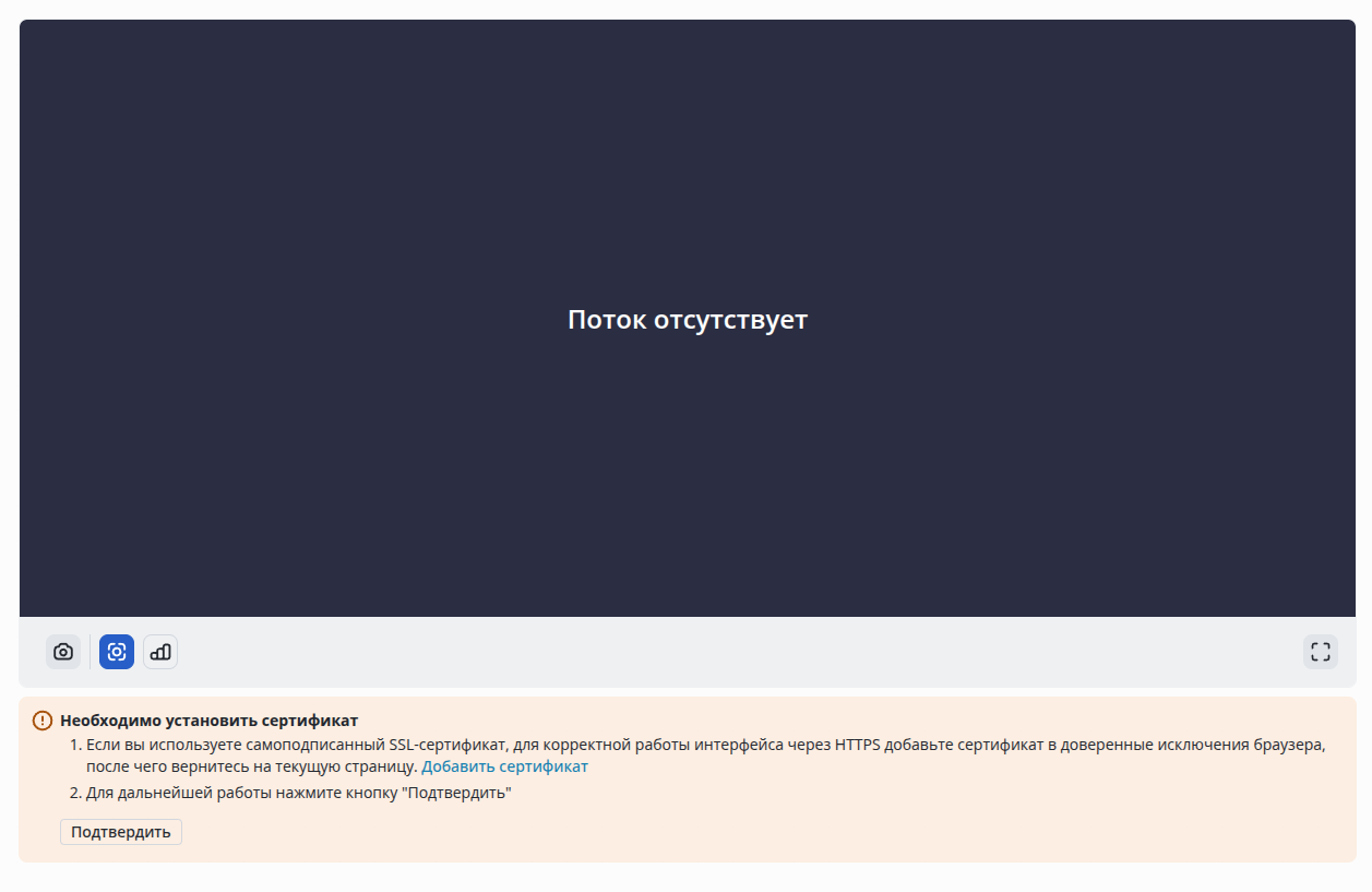 При использовании самоподписанного сертификата потребуется подтвердить его исключение в плеере для просмотра видеопотока с камеры.
