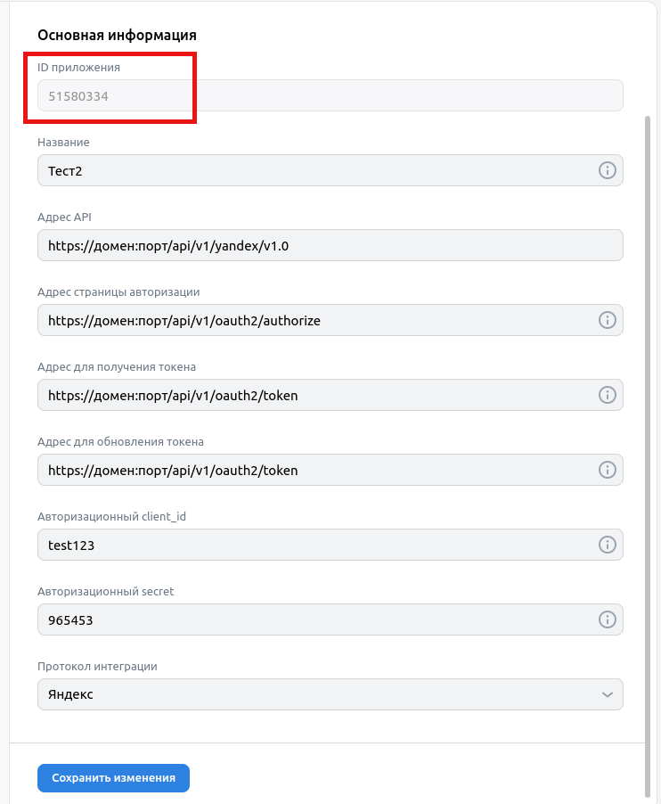 Авторизационный client_id | Любое | Идентификатор приложения задается тем, кто настраивает интеграцию. Допускается указание любого уникального значения (не совпадающего с Client ID других интеграций). |