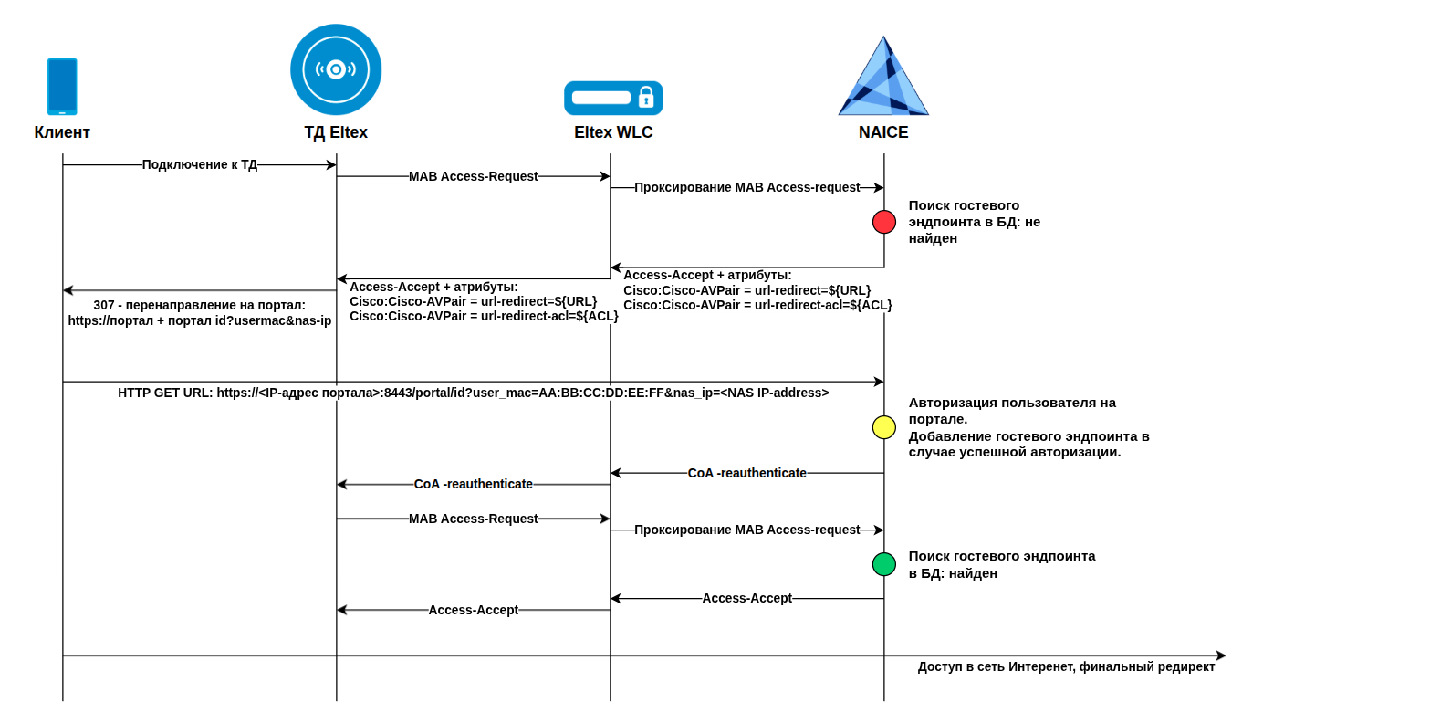 9. При успешном прохождении портальной авторизации (по логину/паролю или с регистрацией и подтверждением номера по СМС) для устройства клиента добавляется запись о гостевом эндпоинте, содержащая MAC-адрес клиента.