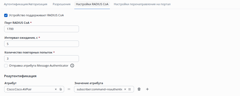 • Реаутентификация — условие RADIUS-атрибутов, которые будут отправлены на устройство в момент перерегистрации клиента.