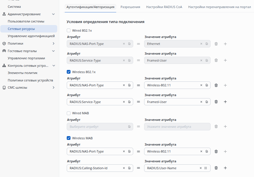 В блоке «Аутентификация/Авторизация» необходимо настроить условия RADIUS-атрибутов для определения того, каким образом подключается пользователь.