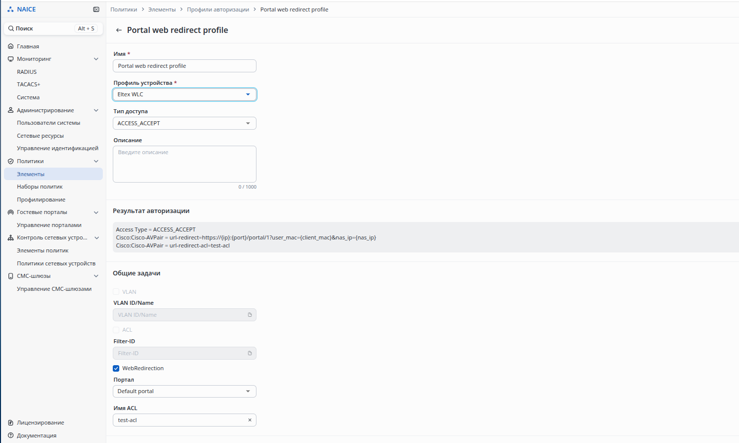 Для быстроты и удобства в NAICE реализованы дефолтные сущности для настройки портала, которые можно использовать, редактировать или применять свои. В примере будет представлен Eltex WLC.