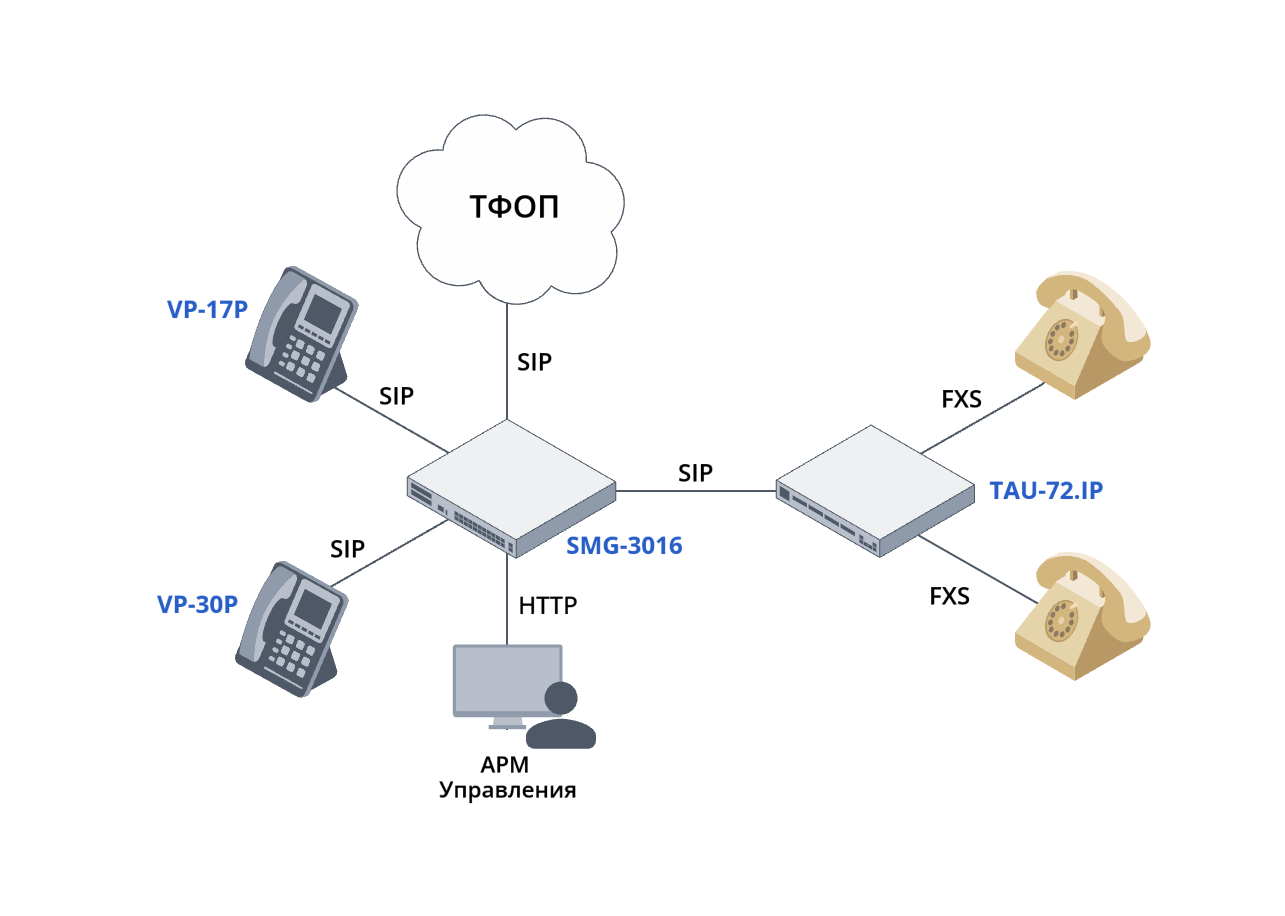 Для связи с ТфОП используются соединения по протоколу SIP через оператора предоставляющего доверенный стык Ethernet.