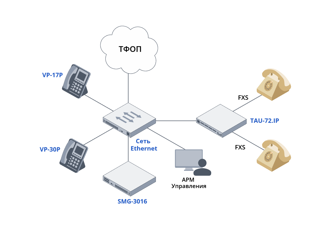 Абонентский шлюз подключается через сеть Ethernet к IP АТС. Абоненты регистрируются на АТС по SIP.