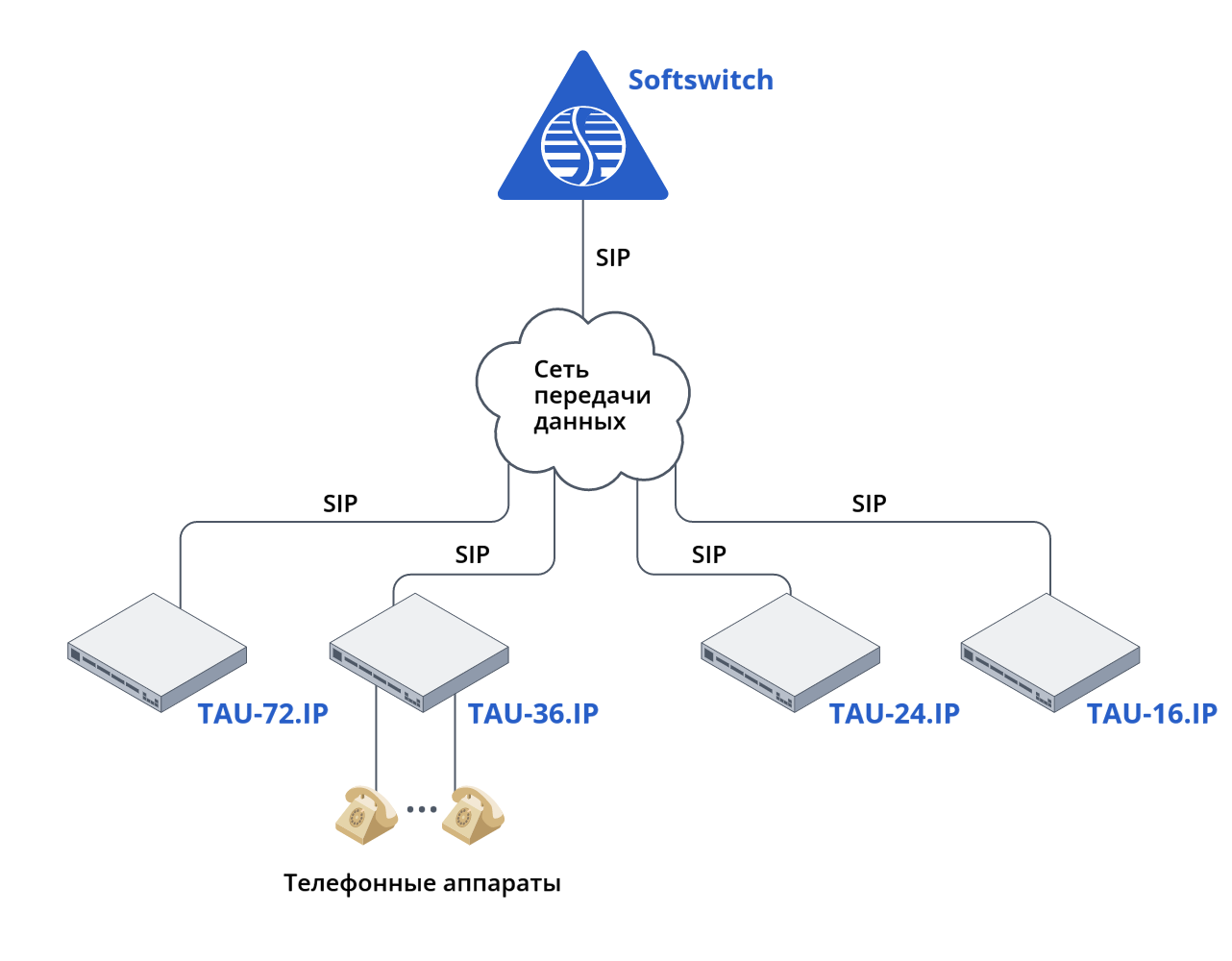Рисунок 1. Схема использования абонентских VoIP-шлюзов серии TAU