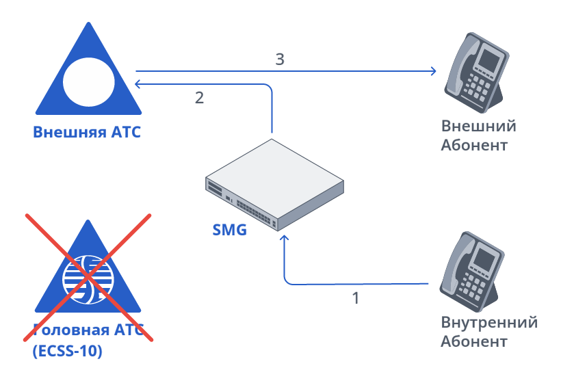 - Головная АТС, получив вызов с номера транзитной регистрации на внешний номер по маршрутизации, отправляет вызов через SIP trunk обратно на SMG (узел выживания).