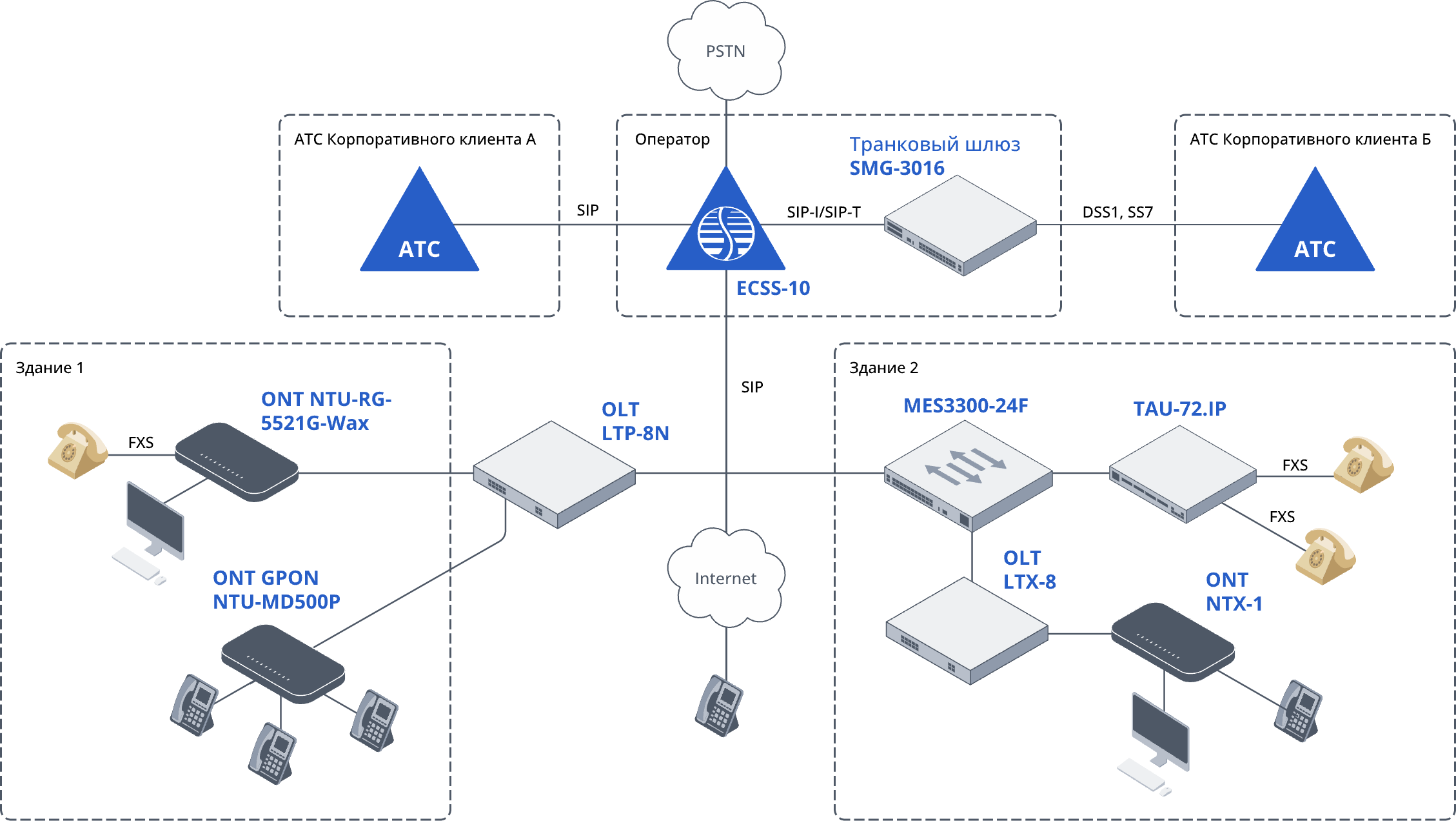 Корпоративные клиенты, имеющие собственные АТС, подключаются к ядру с использованием протокола SIP через сеть IP или по протоколам DSS1 или SS7 (ОКС-7) через потоки E1, организуемые посредством транкового шлюза SMG-3016.
