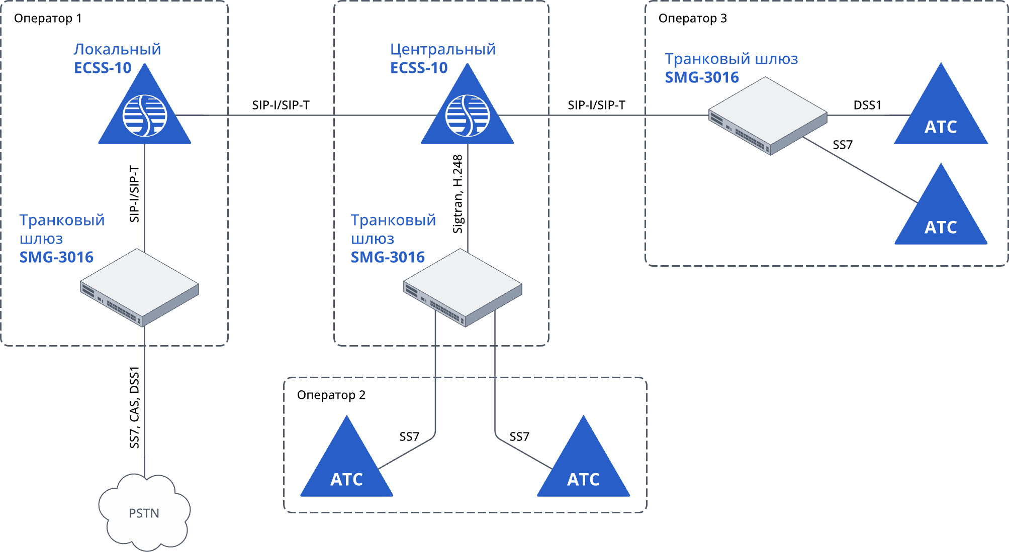 Интеграция с внешними автоматическими телефонными станциями и телефонной сетью общего пользования осуществляется посредством протоколов SIP, SIP‑I и SIP‑T. В случае необходимости подключения по протоколу ОКС‑7 (SS7) задействуется транковый шлюз SMG‑3016.