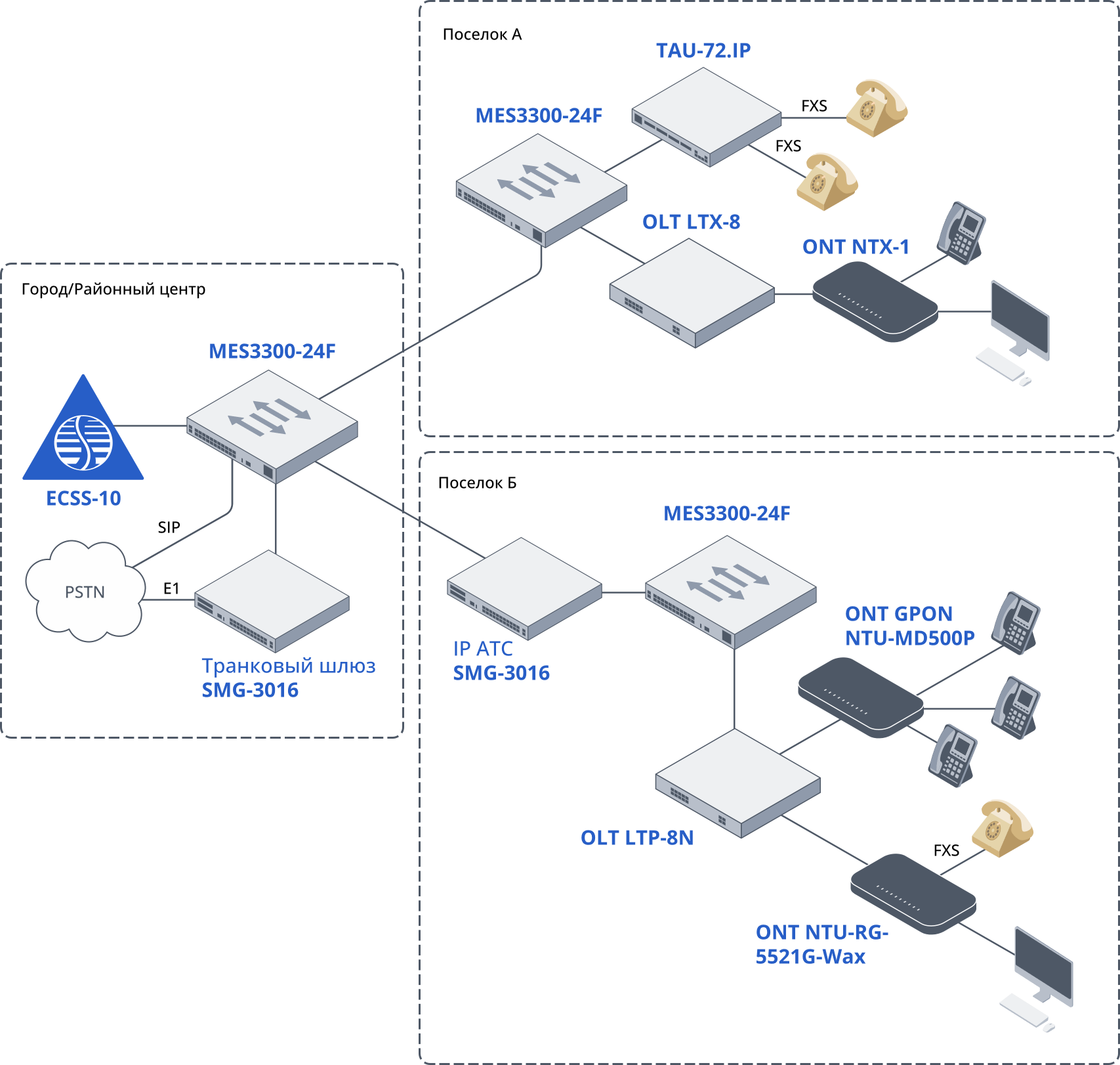 В этом сценарии используется оборудование и ПО Eltex (например, VoIP‑шлюзы, терминалы оптических линий, абонентские оптические терминалы) для организации телефонной связи в густонаселенных районах, таких как города. Типовая схема представлена на Рисунке 2.