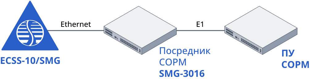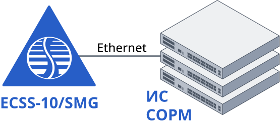 В комплексе ECSS-10 и в IP АТС SMG заложены возможности для выполнения требований к системе технических средств по обеспечению функций оперативно-розыскных мероприятий на электронных АТС, утвержденные приказом Госкомсвязи России № 70 от 20.04.1999 и приказом Минкомсвязи России №268 от 19.11.2012. Подключение к пульту управления (ПУ) СОРМ спецслужб осуществляется при помощи посредника СОРМ, реализованного на базе шлюза SMG-3016, по соединительным линиям (СЛ). Схема подключения приведена на рисунке ниже.
