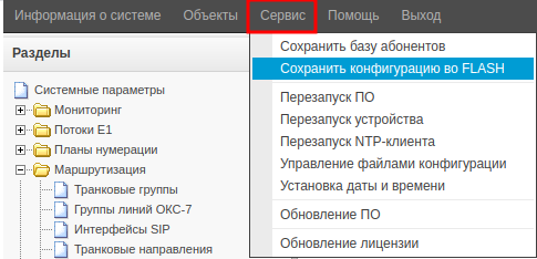 Для сохранения конфигурации в верхнем меню «Сервис» выберите пункт «Сохранить конфигурацию во FLASH» и во всплывающем окне нажмите кнопку «Ок».