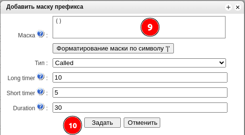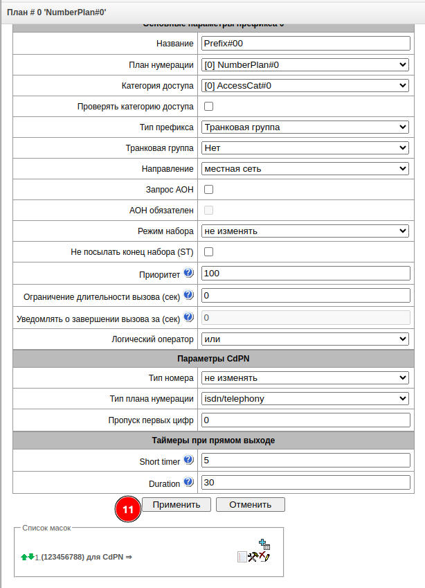 - Заполнить поле «Маска». Номера, подпадающие под маску, будут направлены в указанную выше транковую группу. Синтаксис маски и примеры её работы приведены в пунктах «Описание маски номера и ее синтаксис» и «Примеры работы маски» раздела Руководства по эксплуатации.