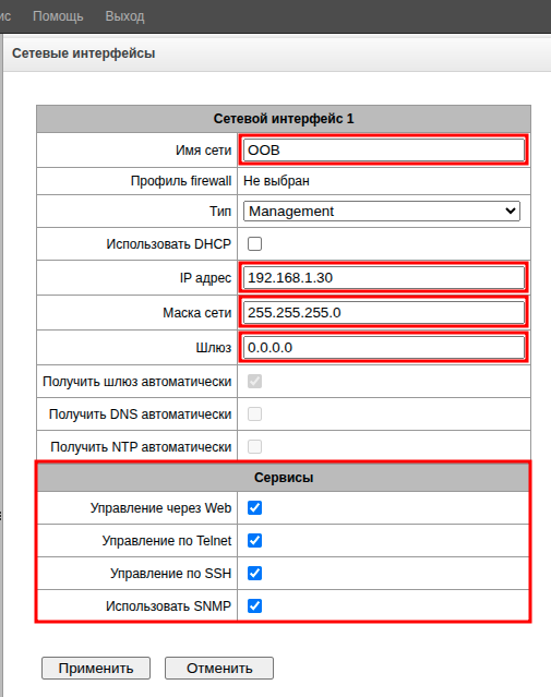Интерфейс управления не связан с остальными Ethernet-интерфейсами устройства. Если управление осуществляется не из той же подсети, где находится интерфейс управления, то шлюз должен быть указан и доступен.