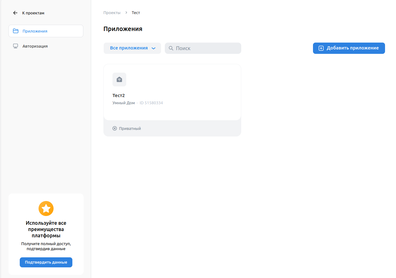 3. Созданное приложение отобразится на странице Приложения.