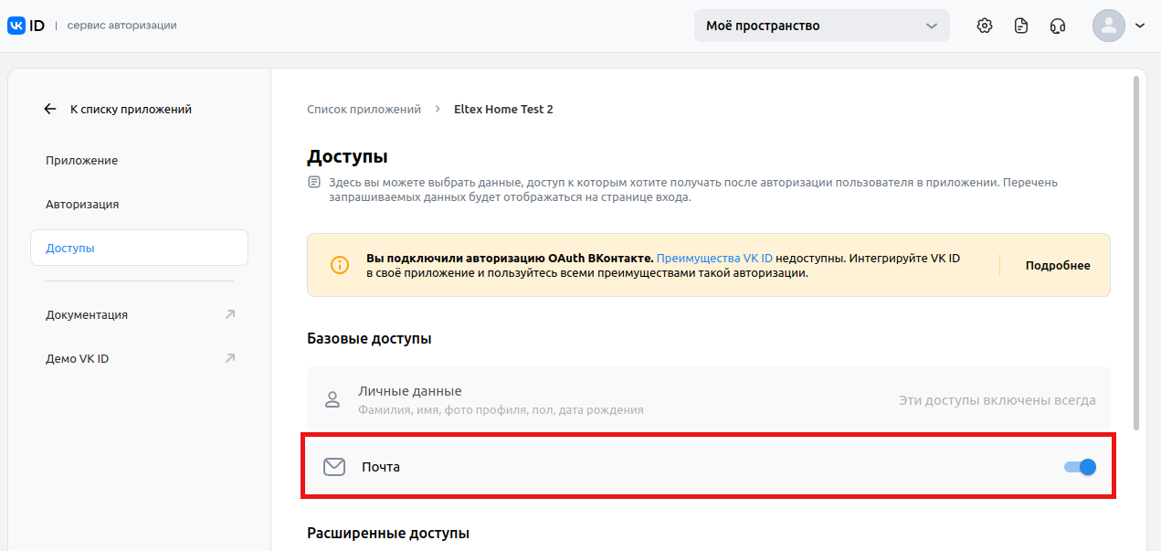 5. В настройках приложения перейдите в раздел «Доступы» и активируйте пункт Почта.