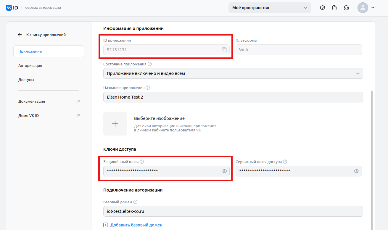 6. В настройках приложения перейдите в раздел «Приложение». Вам понадобятся значения полей ID приложения и Защищенный ключ: