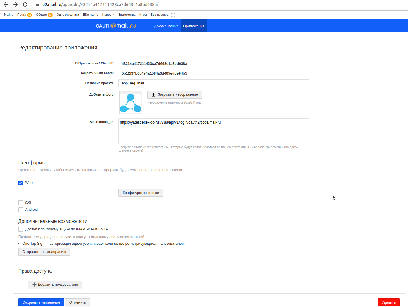| Значение поля "Client ID" | "Client ID", полученный во время регистрации приложения в OAuth Mail. |