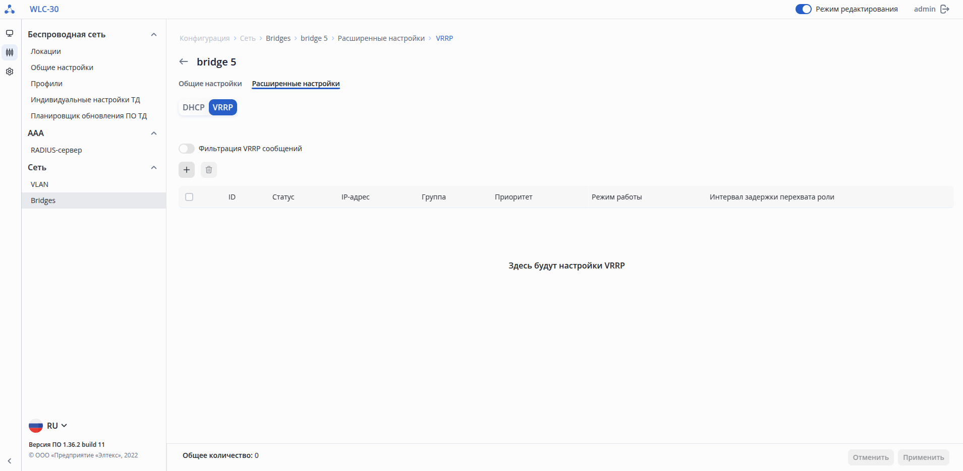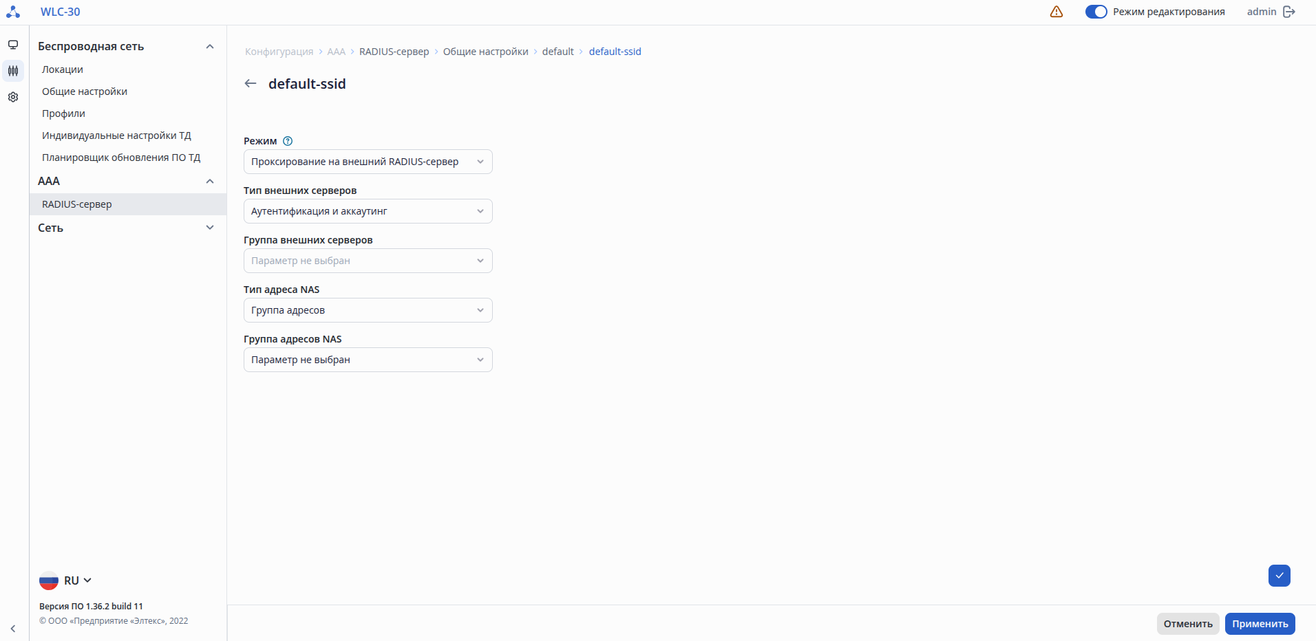 Для сброса конфигурации к заводским настройкам должен быть включен режим редактирования.
