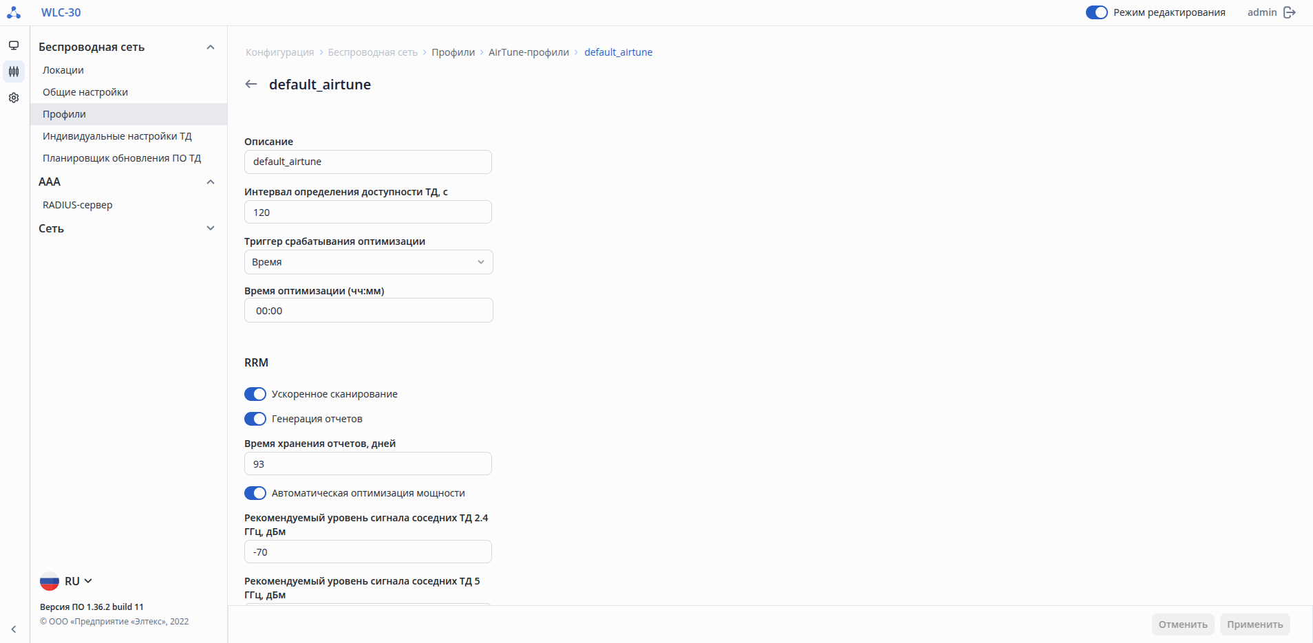 - Настроить – создание индивидуального профиля настроек точки доступа, в котором присутствует возможность задать имя ТД, переопределить локацию или профиль общих настроек ТД, переопределить параметры радиопрофилей, такие как режим работы радиоинтерфейса, канал, ширина канала, мощность, а также отключить использование AirTune. Действие доступно при включенном режиме редактирования.